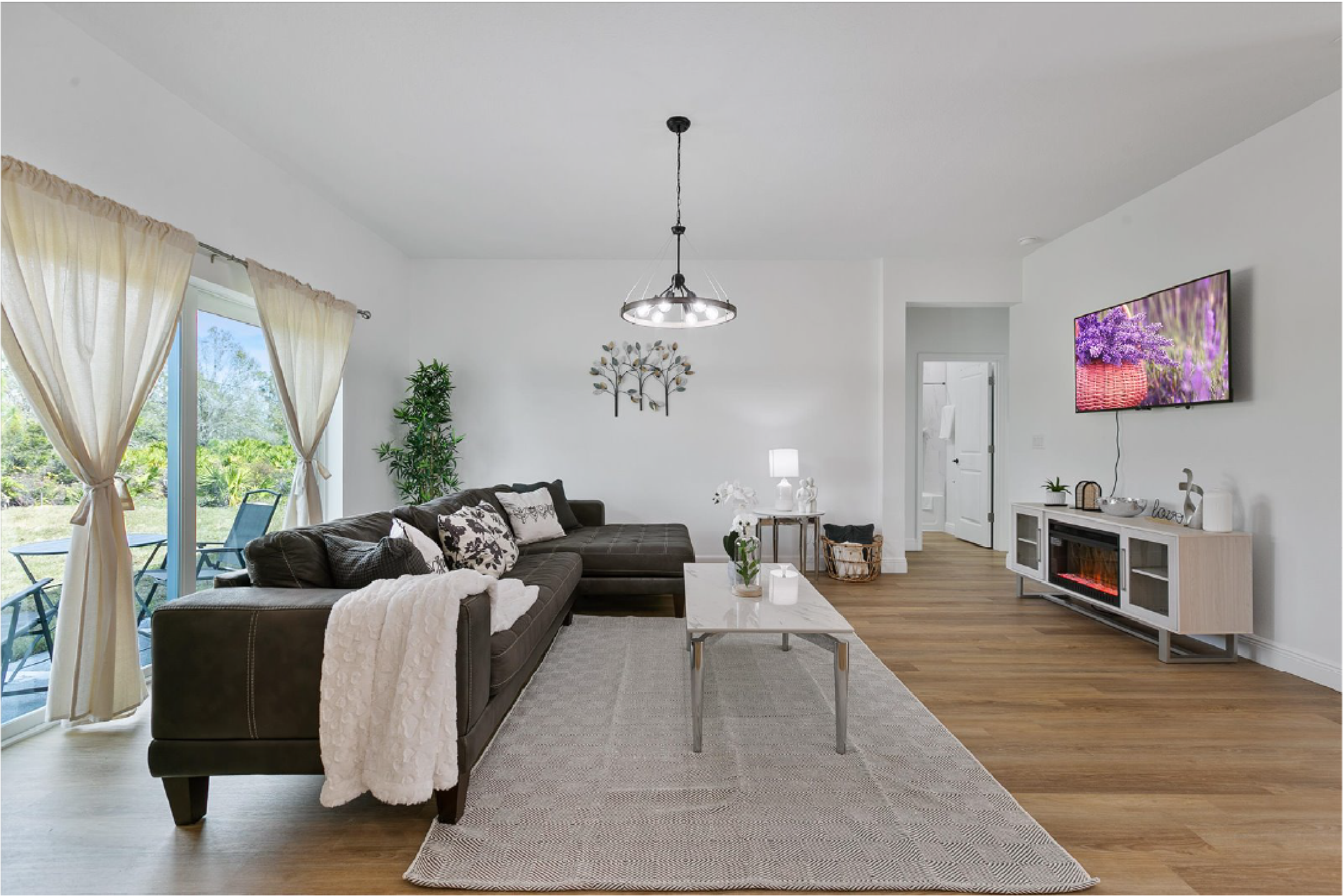 El dormitorio principal cuenta con una acogedora cama tamaño king y un baño privado. Tres habitaciones adicionales ofrecen un amplio espacio para los huéspedes. Disfruta de una sala abierta con TV inteligente, una cocina totalmente equipada y un garaje privado para estacionar de forma segura.